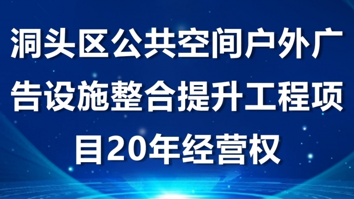 受委托,将于2025年11月18日15时在洞头区政务服务中心二楼开标室对洞头区公共空间户外广告设施整合提升工程项目20年经营权进行增价式拍卖,有关事项公告如下: